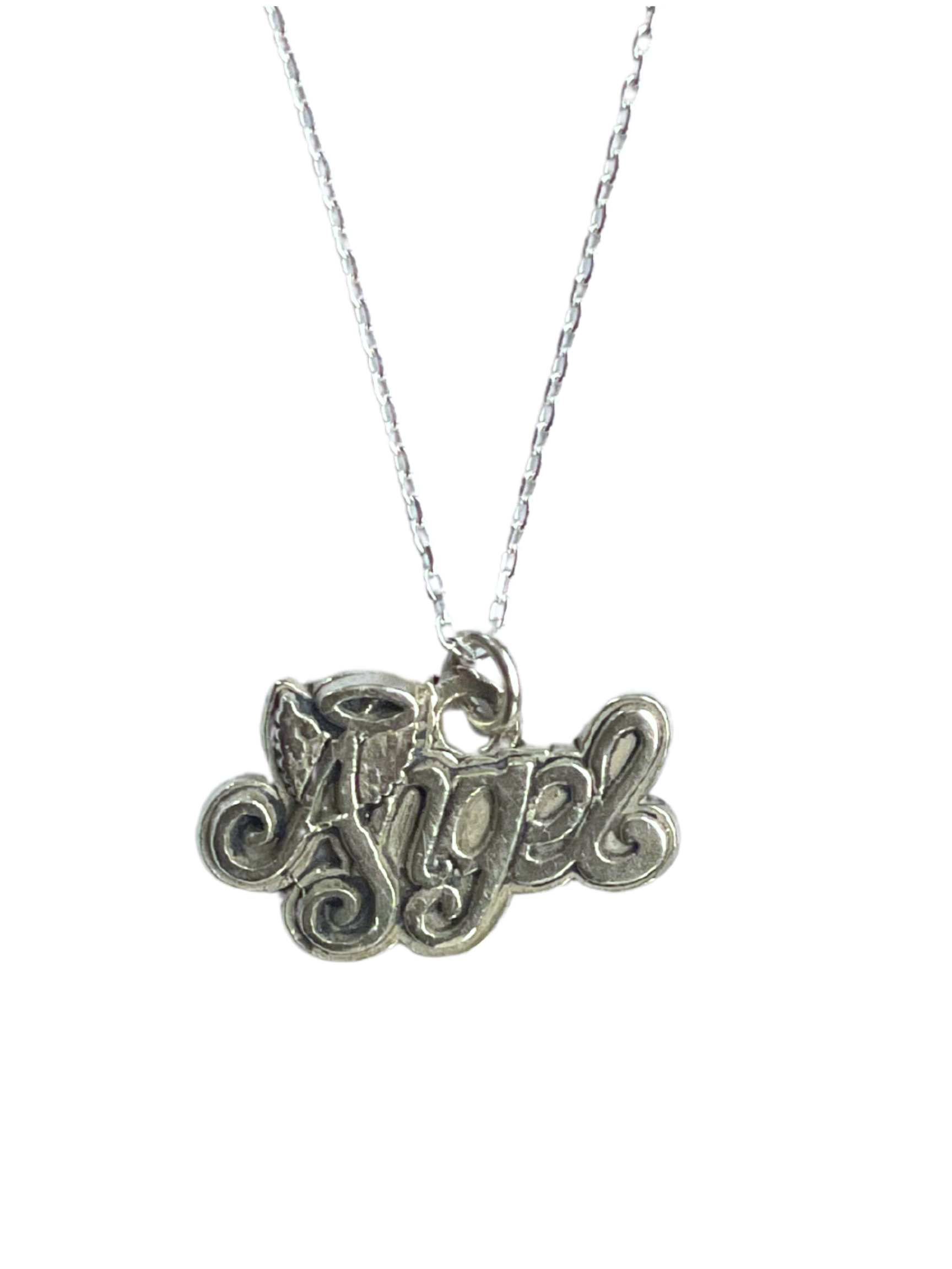 Vintage silver angel script charm imbued with good loving energy for luck, fun, and mischief ☆