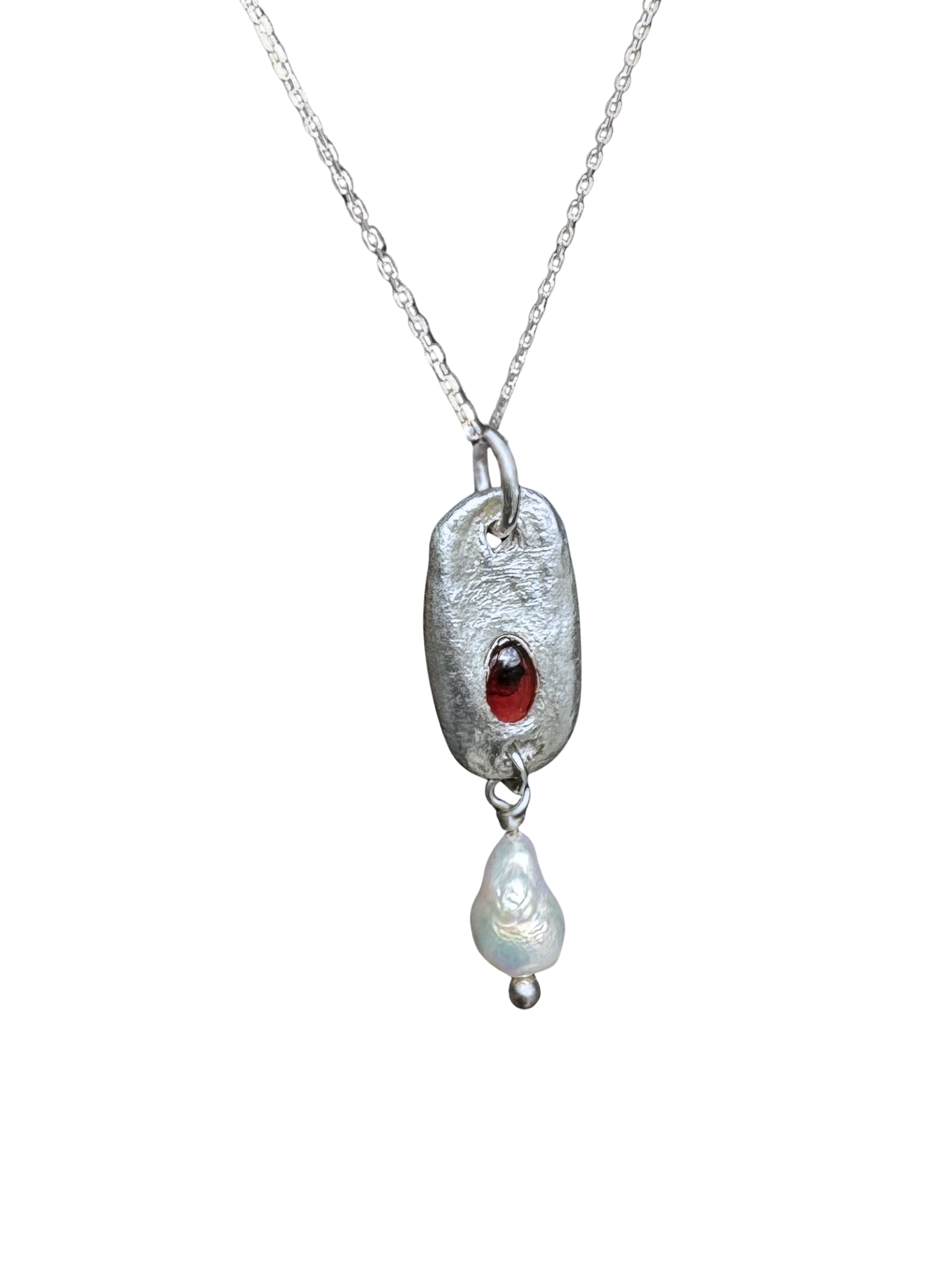Fine silver pool with inlay garnet & dangling freshwater pearl ☆