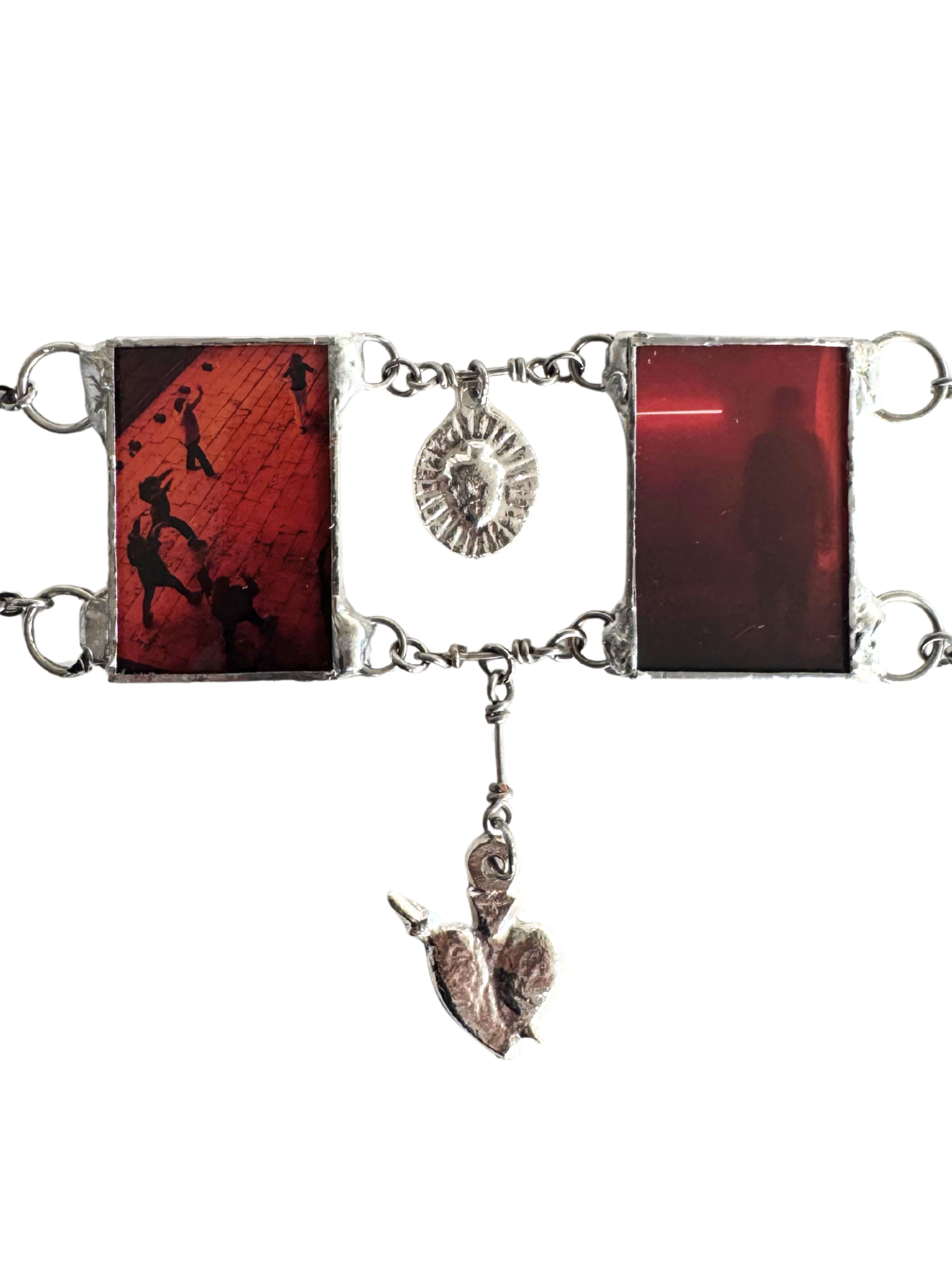 Glass & paper metal reliquary choker with dangling sacred heart milagro charms ☆