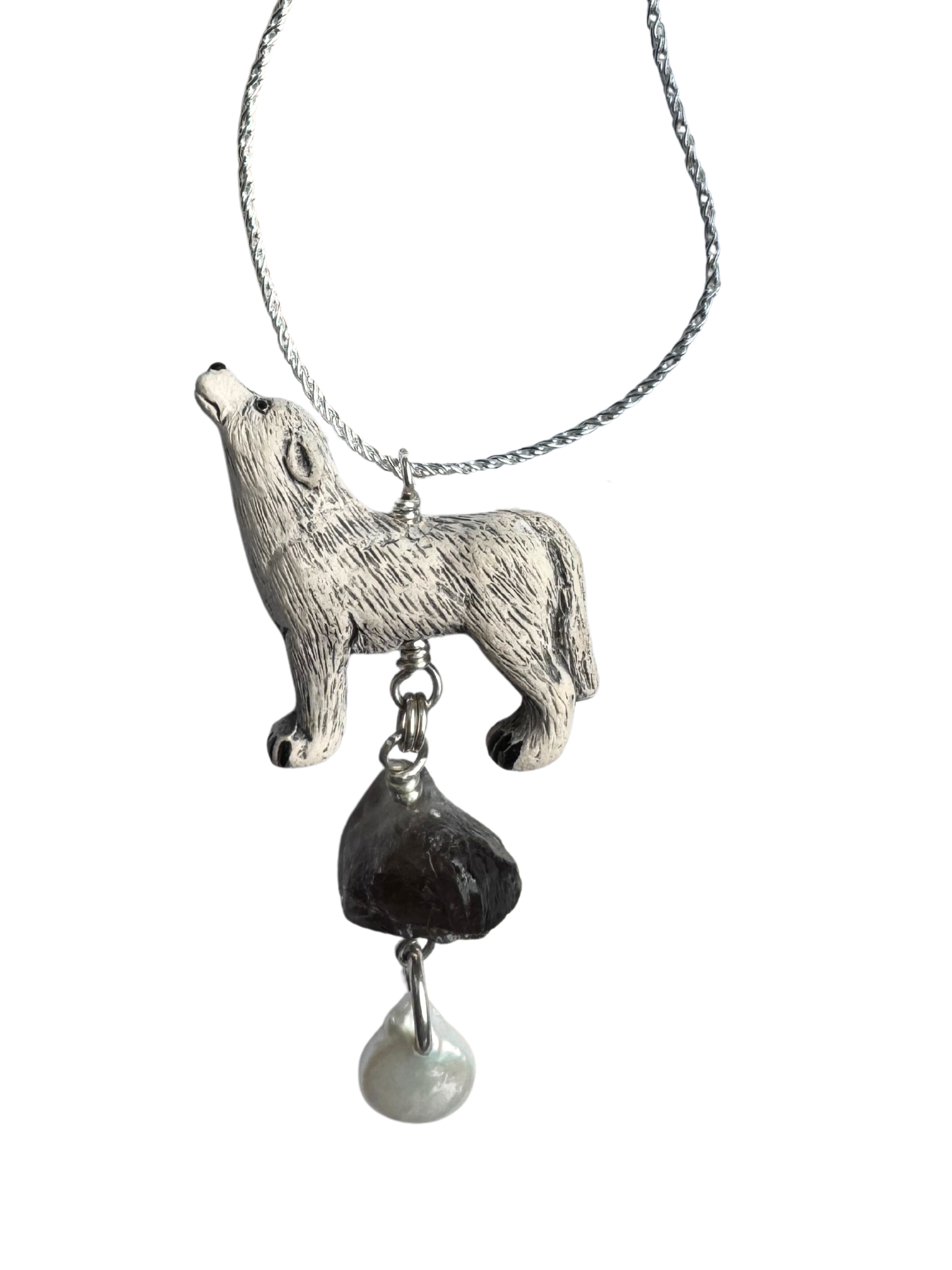 Handmade Peruvian ceramic wolf totem with Smoky Quartz & freshwater pearl with sterling silver. The wolf totem invokes freedom, power & victory.